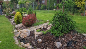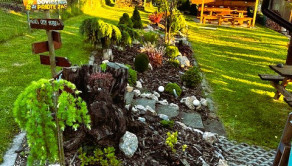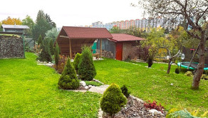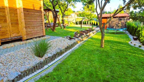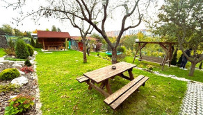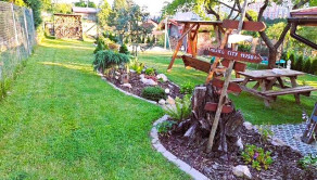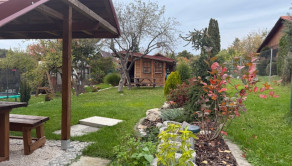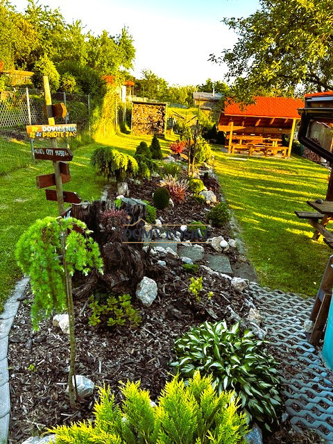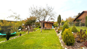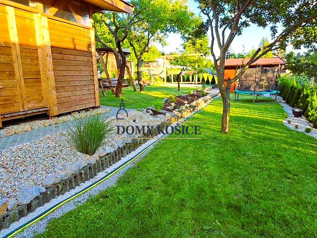 Záhrada je krásne upravnená, nachádzajú sa tu aj ovocné stromy, udržiavaný trávnik, poskytuje dostatok priestoru na rekreačné vyžitie, relax, pestovanie zeleniny, detské hry.