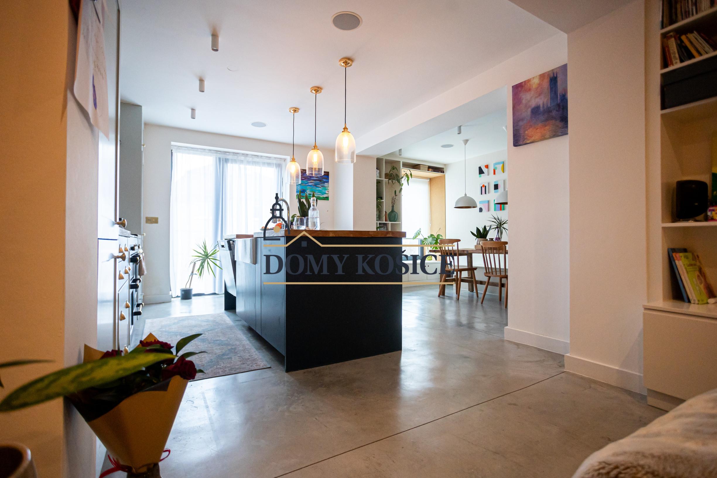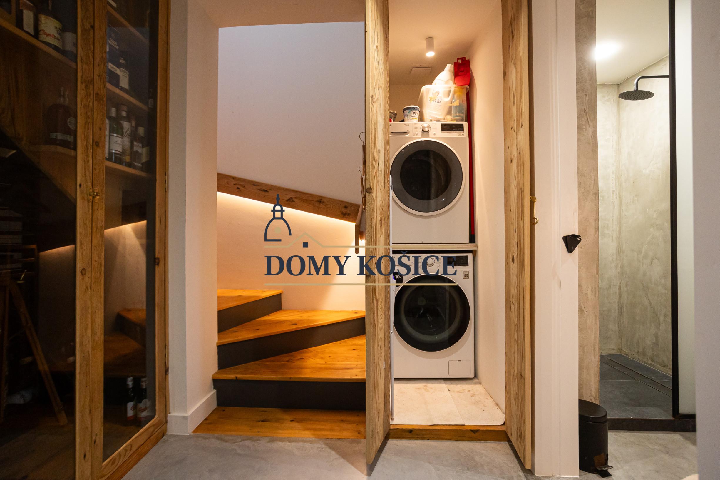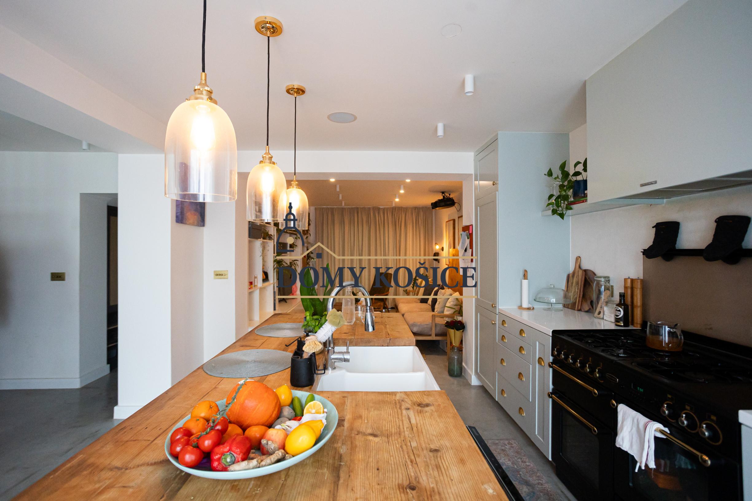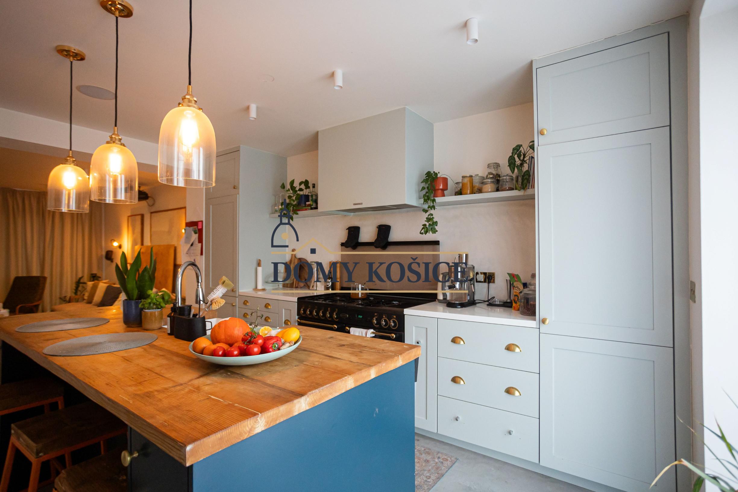 Moderná kuchyňa na mieru (2021) s ostrovčekom a vstavanými spotrebičmi, umývačka riadu Gorenje, varná doska Rangemaster s 5 plynovými horákmi, 2 rúry a gril. Kuchyňa je prepojená s obývacou izbou s vstavaným nábytkom. Výstup z obývačky na terasu a do záhrady. Podlahové kúrenie na celom prízemí.Liaty leštený betón. Kúpeľňa so sprchovým kútom a vstavaným nábytkom. Priestor pre práčku a sušičku. Vinotéka, potravinová skriňa