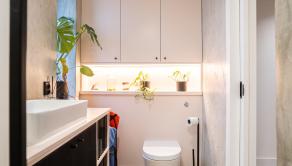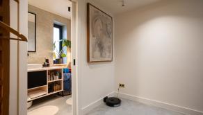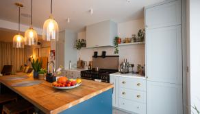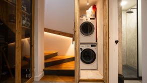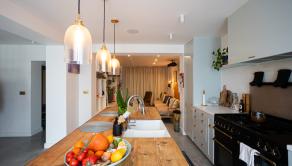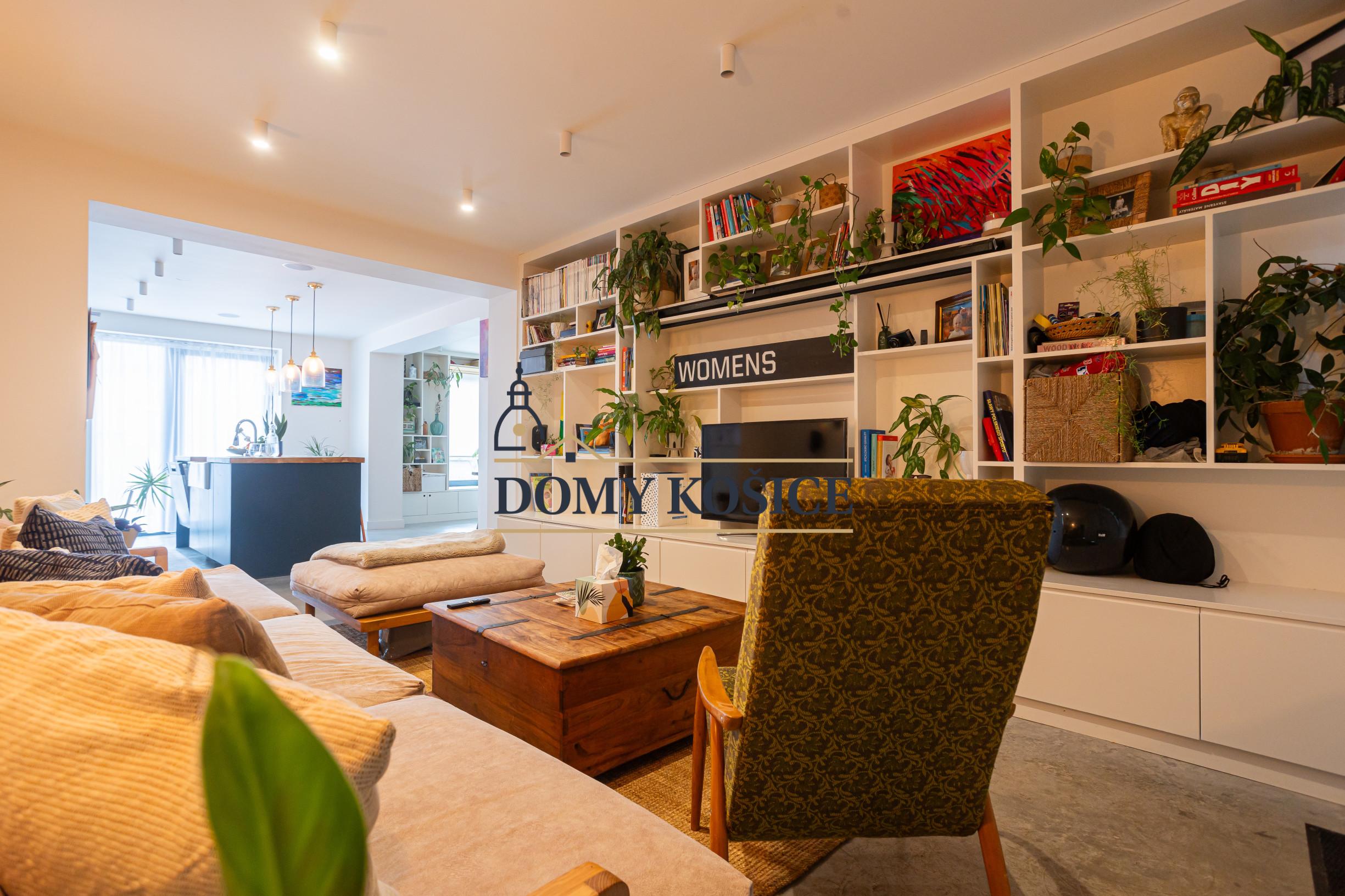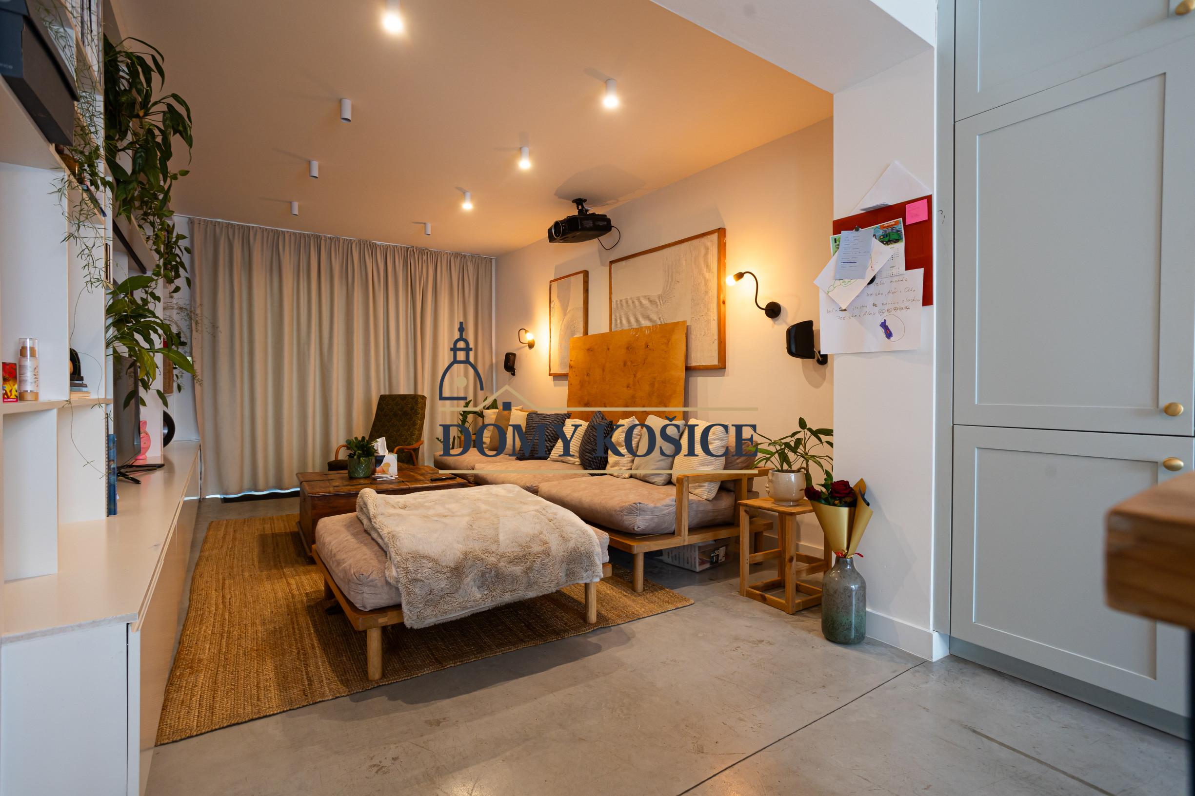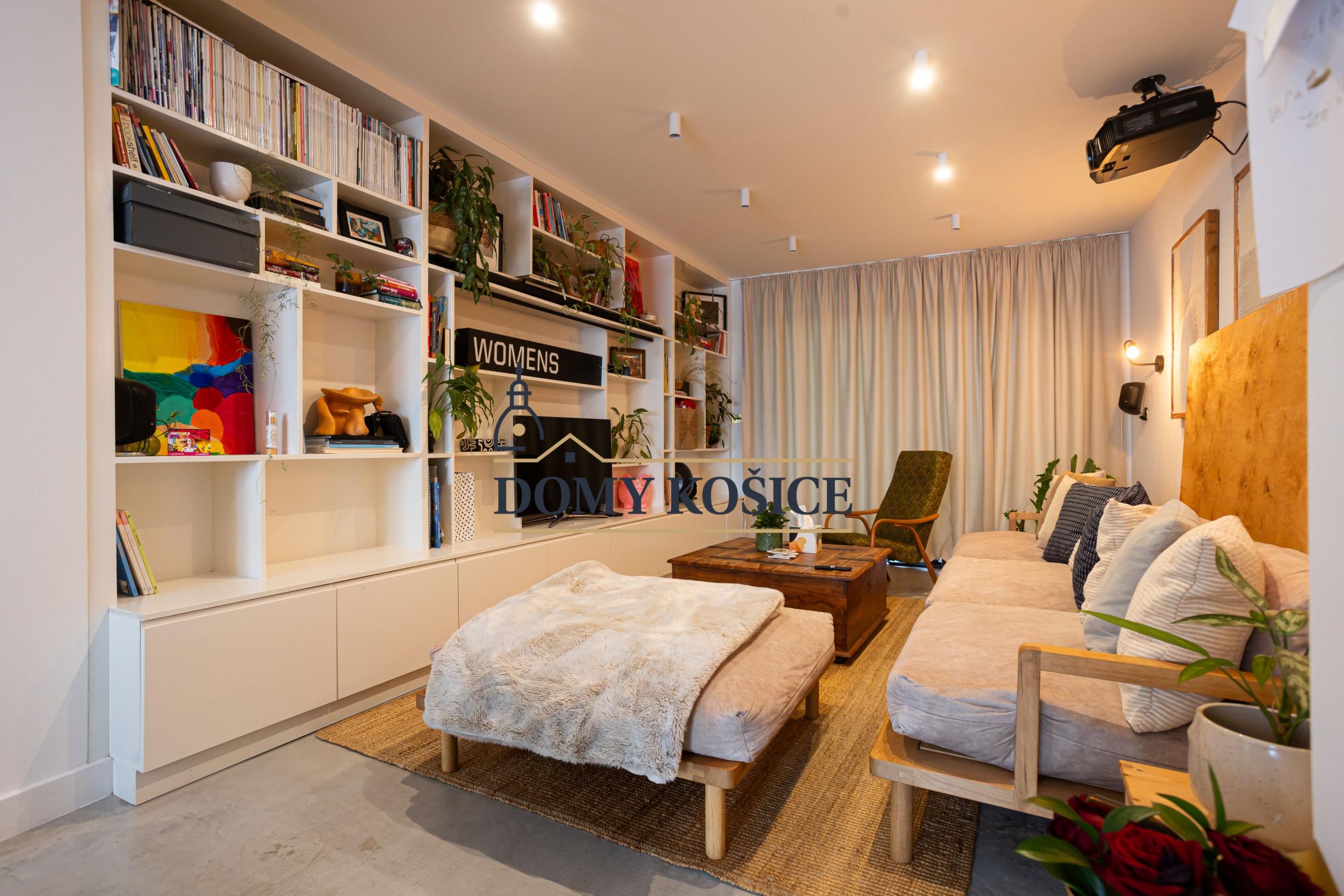 Moderná kuchyňa na mieru (2021) s ostrovčekom a vstavanými spotrebičmi, umývačka riadu Gorenje, varná doska Rangemaster s 5 plynovými horákmi, 2 rúry a gril. Kuchyňa je prepojená s obývacou izbou s vstavaným nábytkom. Výstup z obývačky na terasu a do záhrady. Podlahové kúrenie na celom prízemí.Liaty leštený betón. Kúpeľňa so sprchovým kútom a vstavaným nábytkom. Priestor pre práčku a sušičku. Vinotéka, potravinová skriňa